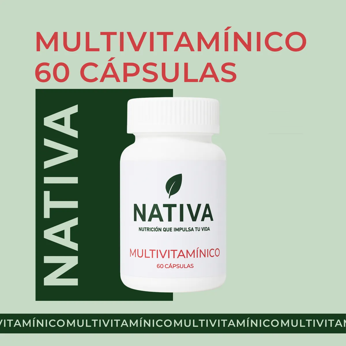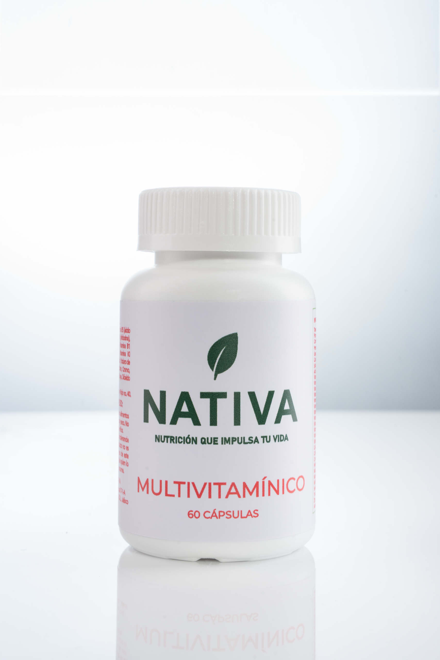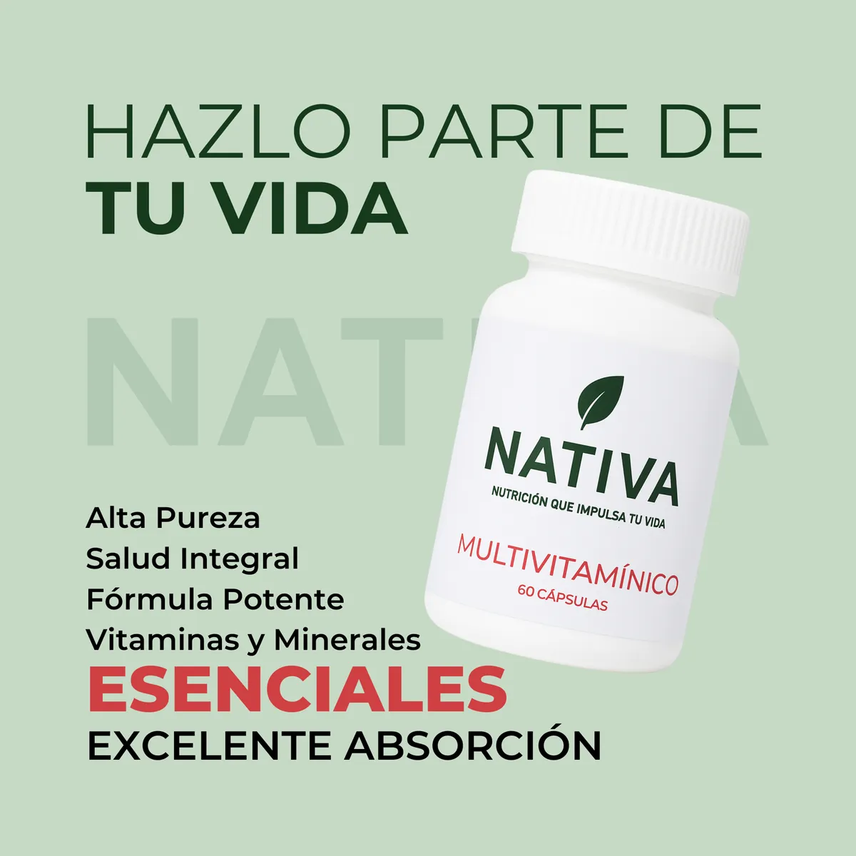 NATIVA Multivitamínico Premium – 60 Cápsulas Adquiere el suplemento alimenticio NATIVA Multivitamínico, un producto diseñado para complementar tu nutrición diaria. Este envase contiene 60 cápsulas, con la dosis recomendada de dos por día. Componentes Principales La fórmula de este producto incluye una combinación de vitaminas y minerales esenciales: Vitaminas: Contiene las vitaminas A, C, D3, E, K1, y las del grupo B (B1, B2, B3, B5, B6, B12, biotina y ácido fólico). Minerales: Incluye calcio, magnesio, hierro, zinc, manganeso, cobre, cromo, molibdeno, selenio y yodo. Otros ingredientes: Omega 3.